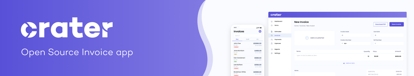 Crater is an open-source web & mobile app that helps you track expenses, payments & create professional invoices & estimates.